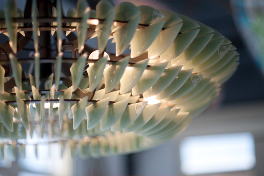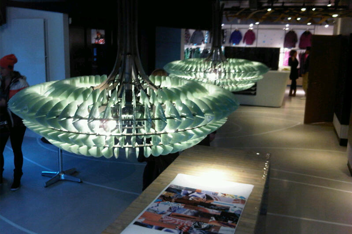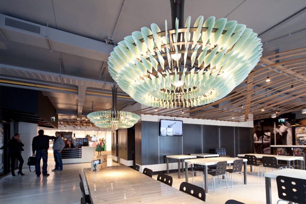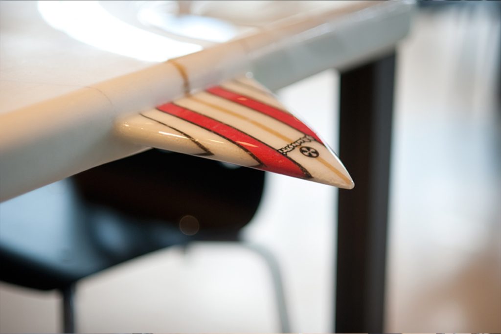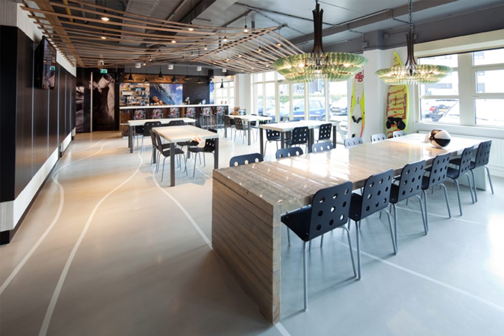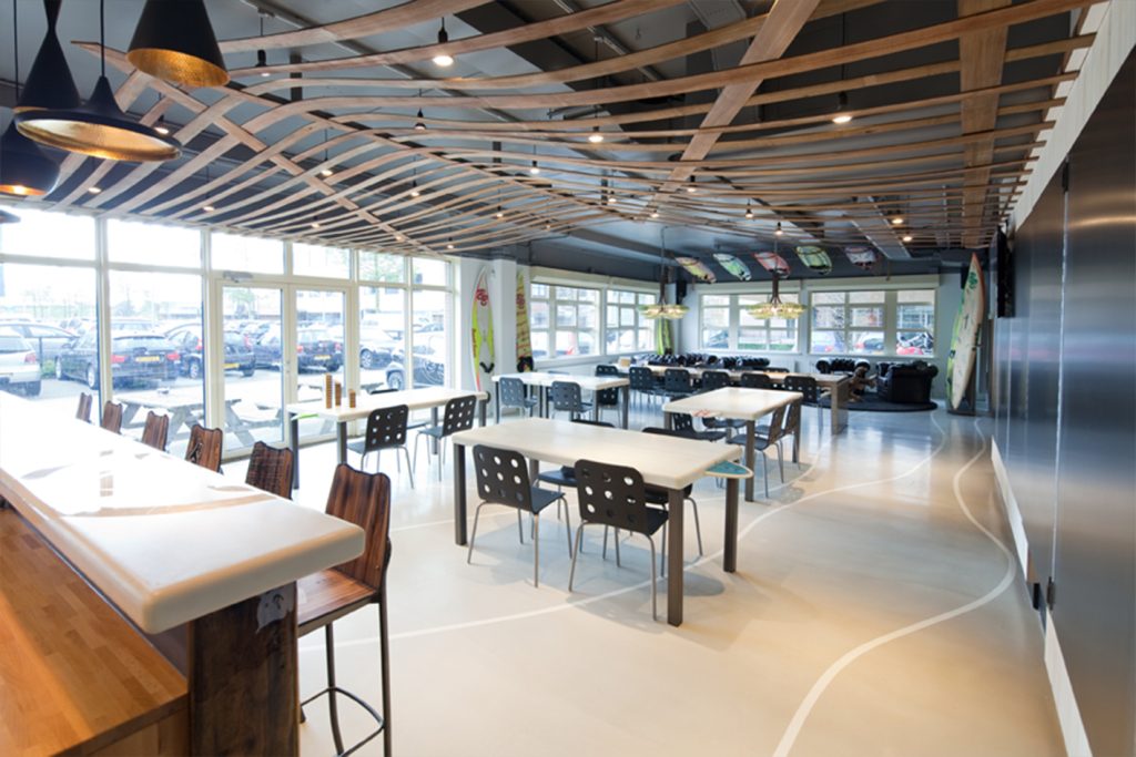 Het idee was om het verouderde kantoorpand nieuw leven in te blazen met een golfbeweging in het plafond, die de verschillende ruimtes rond de kern met elkaar verbindt. Daarbij is gewerkt met materialen en producten uit de surfwereld, zodat het interieur de oorsprong en energie van het merk voelbaar maakt.