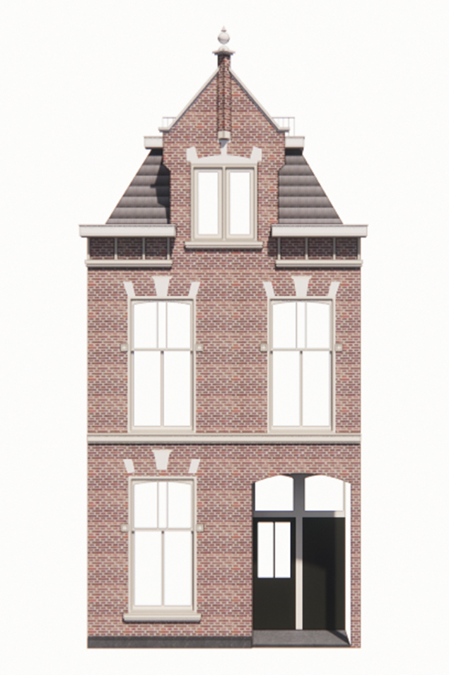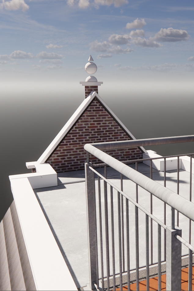 Voor het dakterras op dit pand is een verzinkt spijlenhekwerk de gekozen oplossing. Het hekwerk is transparant en heeft een grijze kleur die wegvalt tegen de lucht. Het wordt gemonteerd binnen de boeiboorden en heeft een set back vanaf de voorgevel, om visueel zo weinig mogelijk aanwezig te zijn. Zo vormt het dakterras een vanzelfsprekend onderdeel van het geheel — bescheiden, helder, en precies goed voor dit stukje Scheveningen.