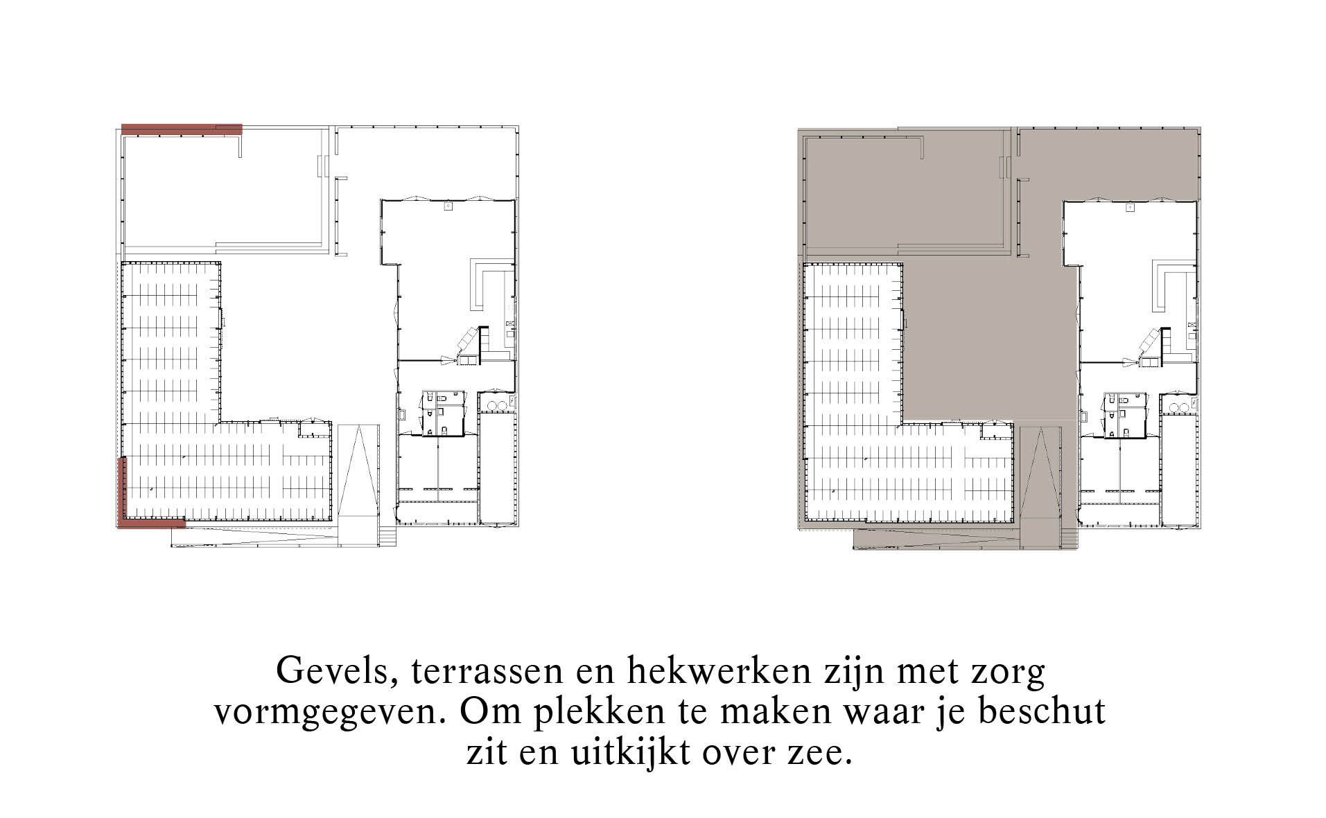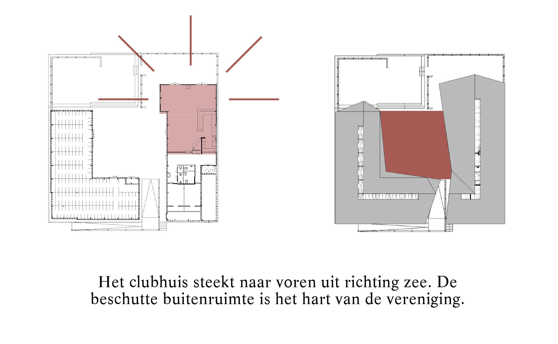 Het idee was een ontwerp te maken écht voor de sporter: om in de luwte te kunnen op- en aftuigen, om materiaal te kunnen stallen, om samen te komen en om elkaar veilig te houden. Ramen naar de zee, ook op de hoeken, geven zicht op de sporters. De reddingsboot staat paraat achter een deur aan de boulevard, zodat hij snel uit kan varen.