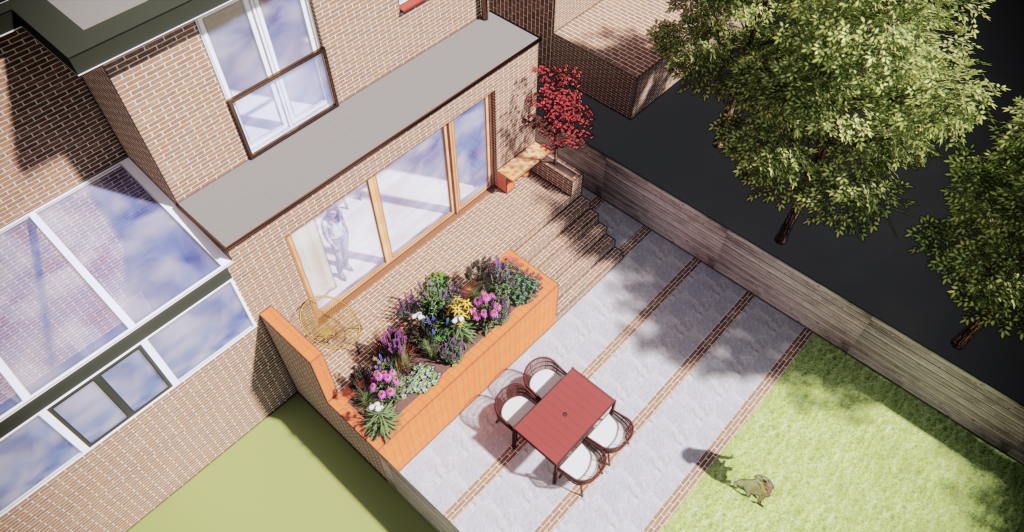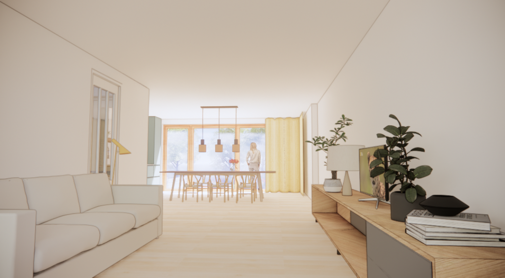 Het idee is om van de begane grond een open plan te maken en de achtergevel te voorzien van een woningbrede glazen pui, zodat het licht diep de woning binnenkomt. In de nieuwe indeling is met aandacht een open keuken geïntegreerd. Door een terras te bouwen met een geïntegreerde trap naar de tuin wordt de tuin bij het wonen betrokken en ontstaat een heerlijke woning.